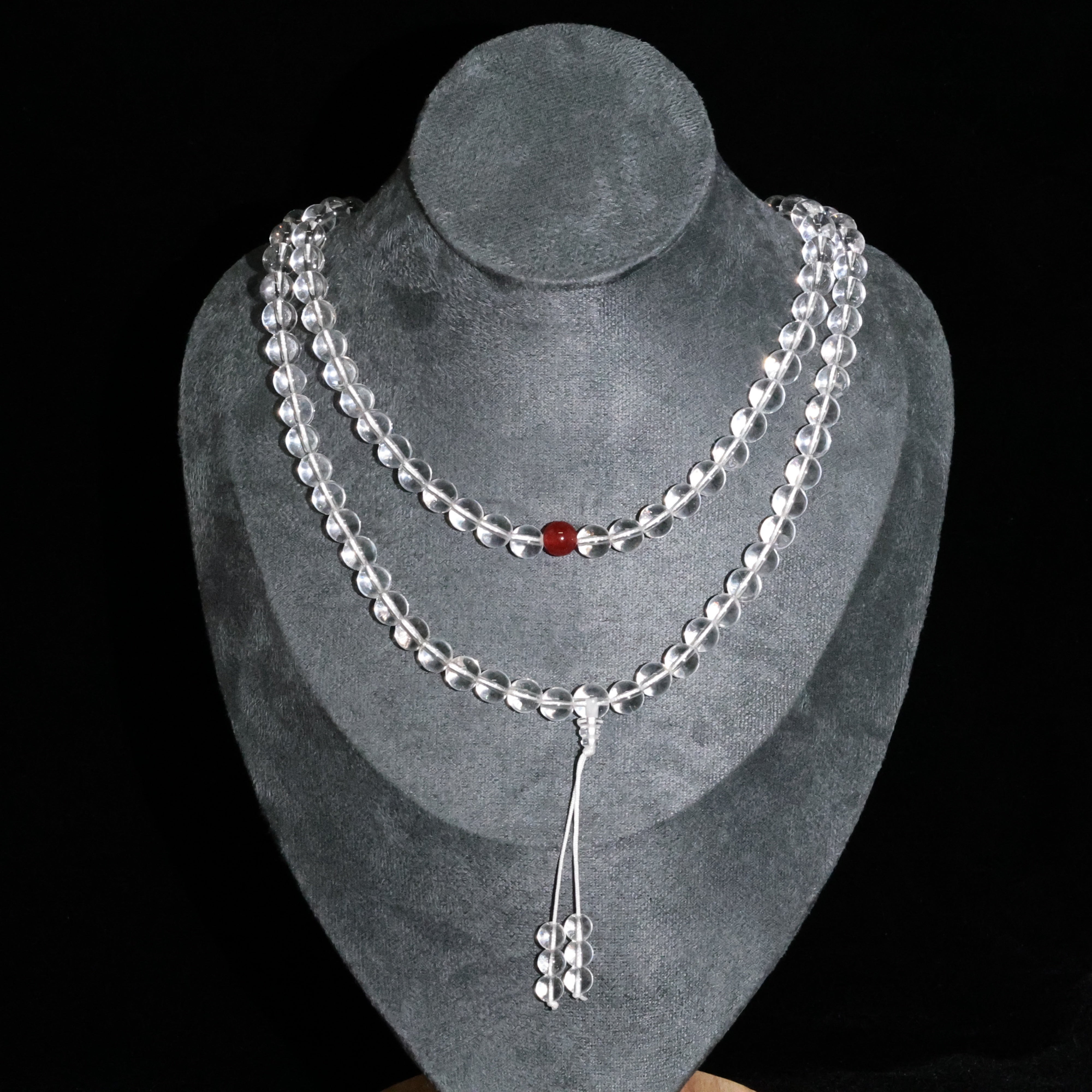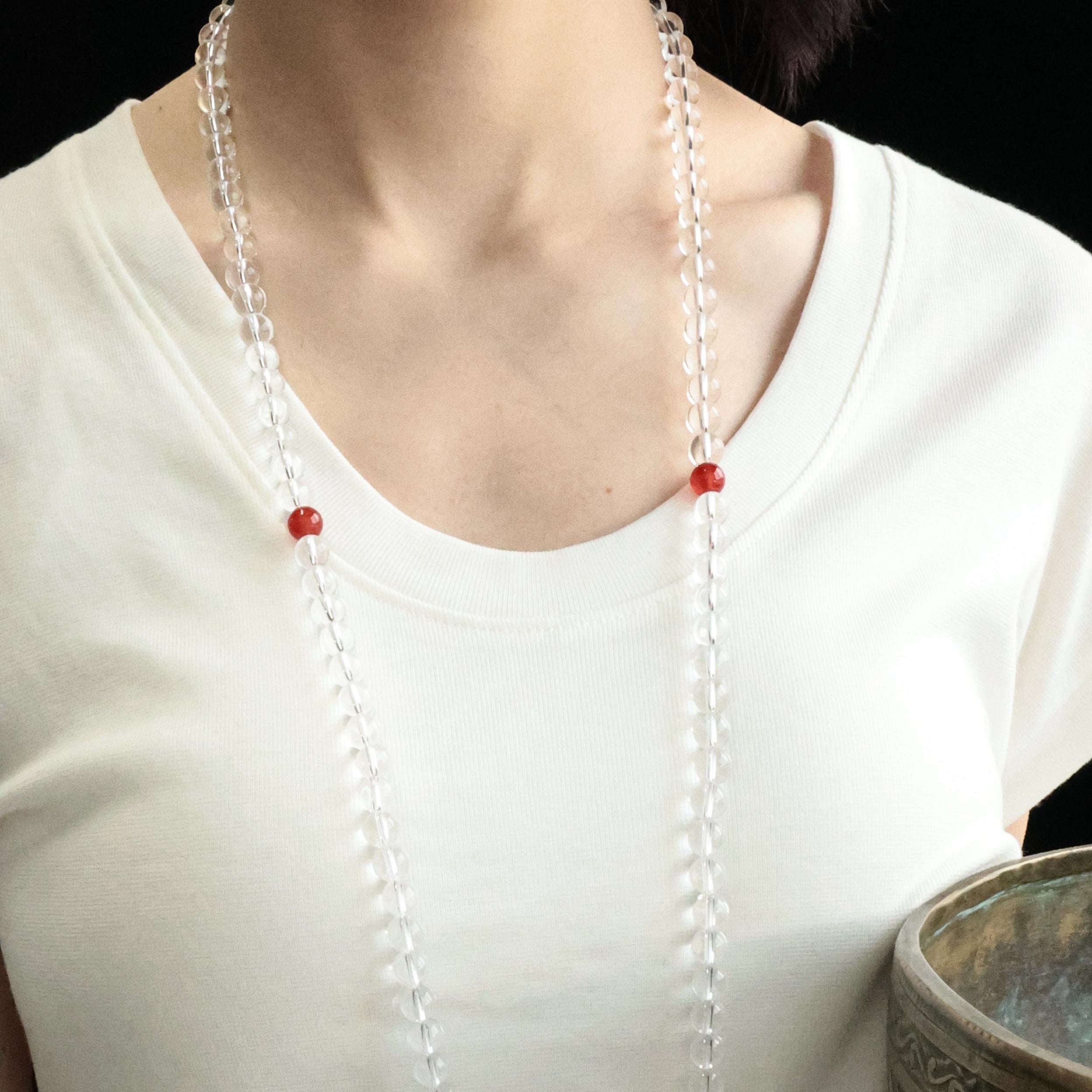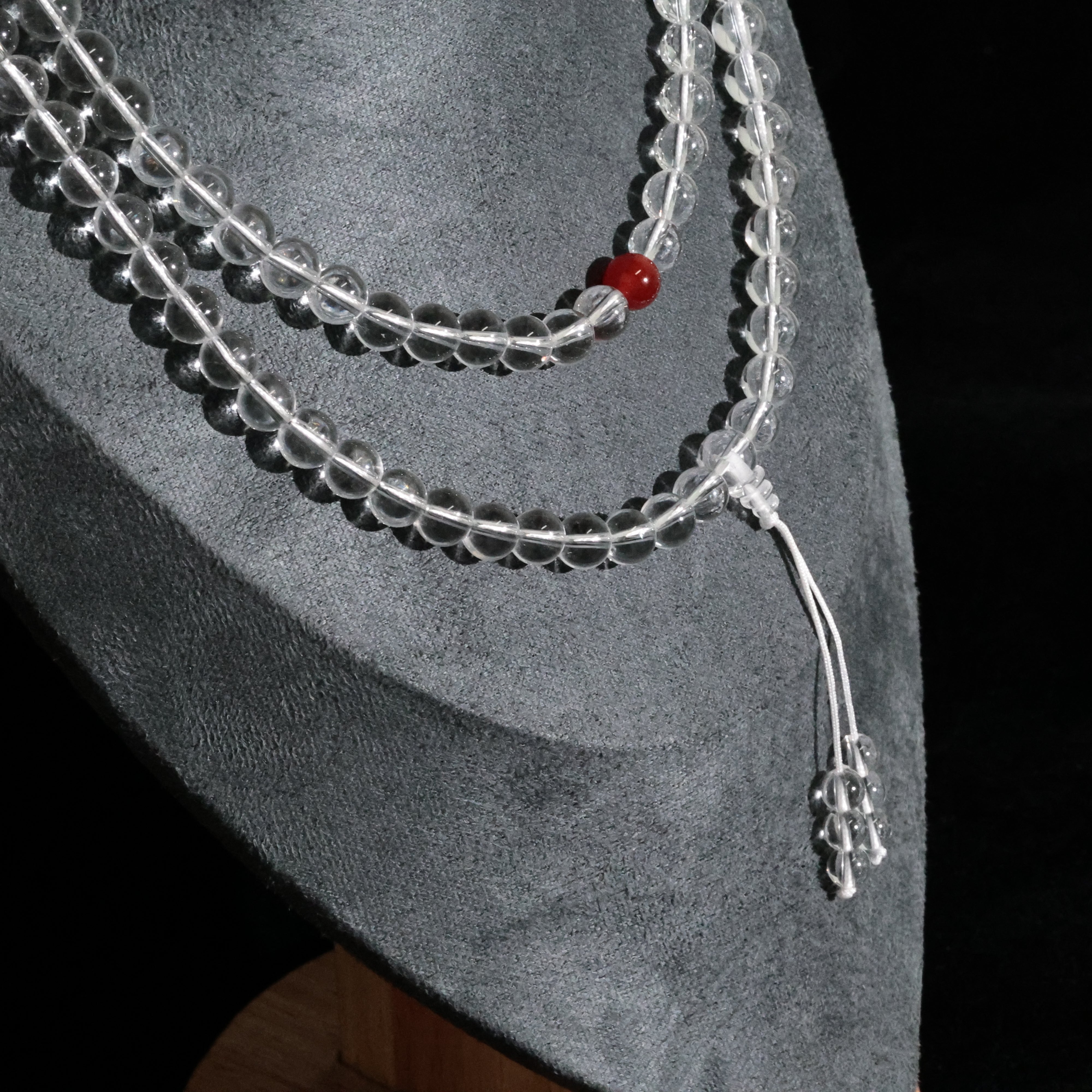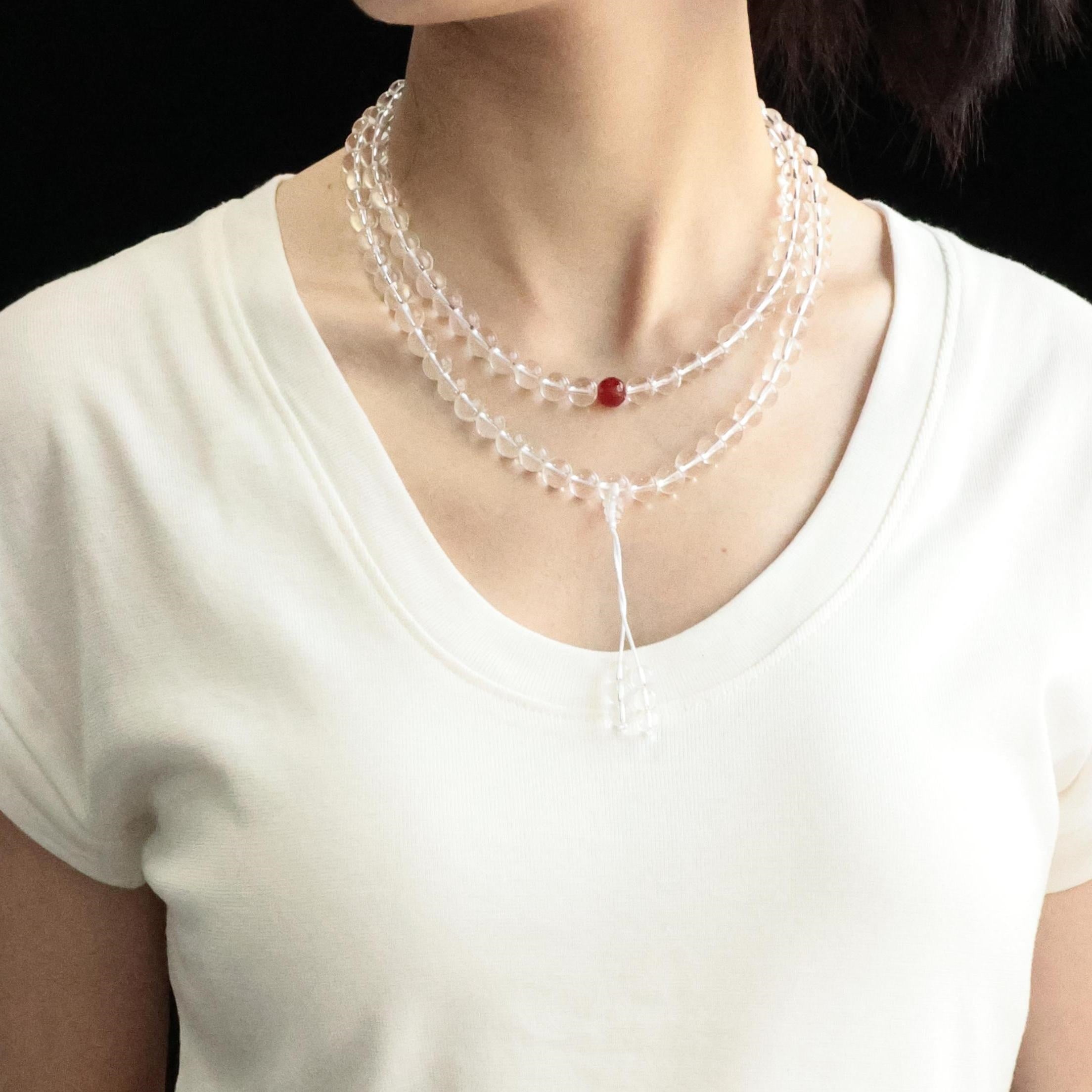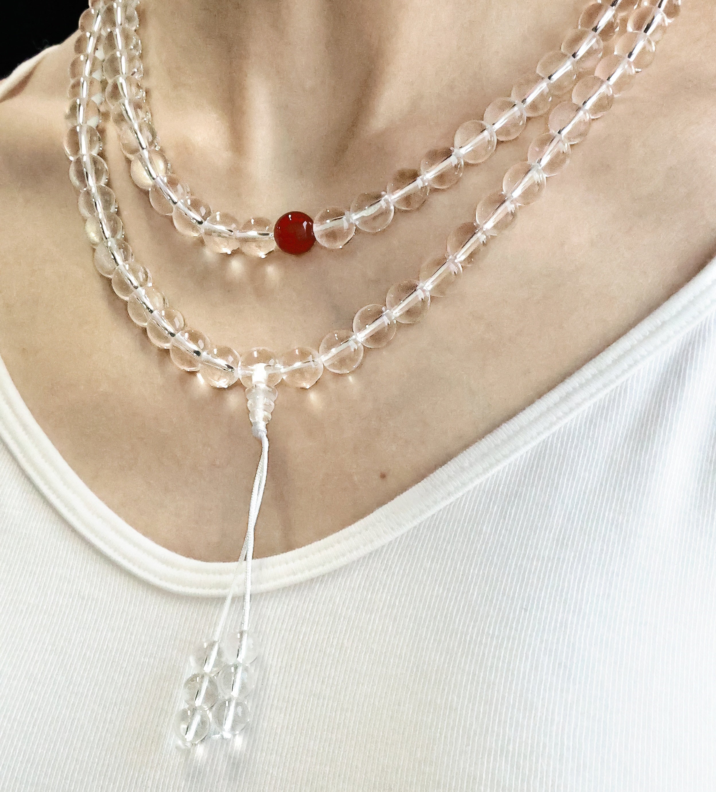 白水晶は「万能の石」として知られ、持つ人のエネルギーを浄化し、集中力を高め、心の平穏をもたらします。108個のビーズは、仏教において煩悩の数を表しており、それらを清めることで精神的な成長を促します。このブレスレットは、毎日の瞑想やリラクゼーションをサポートし、心の安定を助けます。重ねることにより、優雅でボリュームのあるデザインが魅力的で、ファッションとしても楽しめるアイテムです。自己成長を目指す方に特におすすめです。