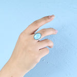 澄み渡る海を想起させる淡い水色が特徴のラリマーを贅沢に使用したリングです。そのやわらかな色合いと自然が紡ぎ出した模様は、まるで静かな波打ち際に差し込む朝の光を閉じ込めたかのよう。ラリマーは「海の宝石」として知られ、その清らかで穏やかなエネルギーは、身に着ける人に内なる平和とリフレッシュした気持ちをもたらすといわれています。