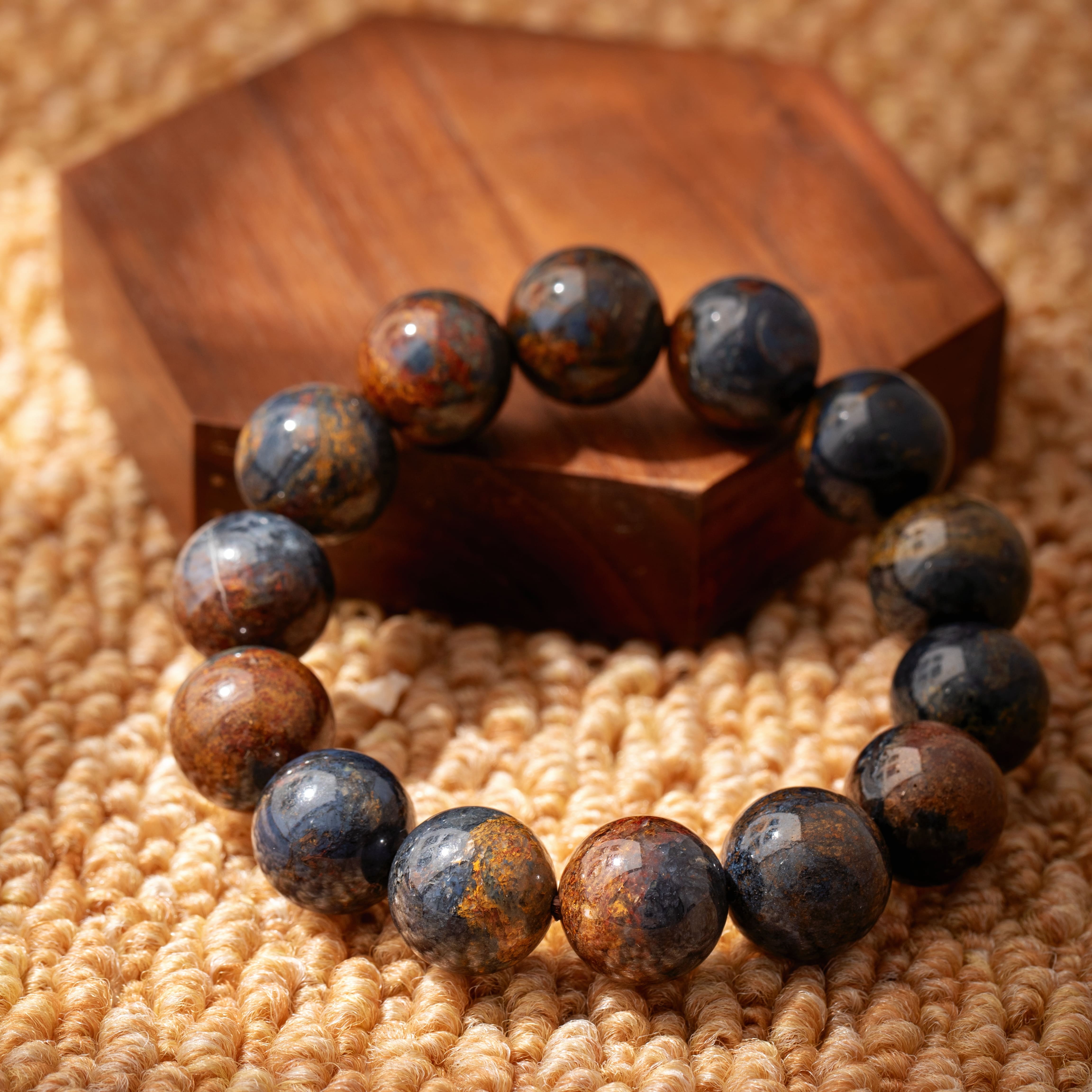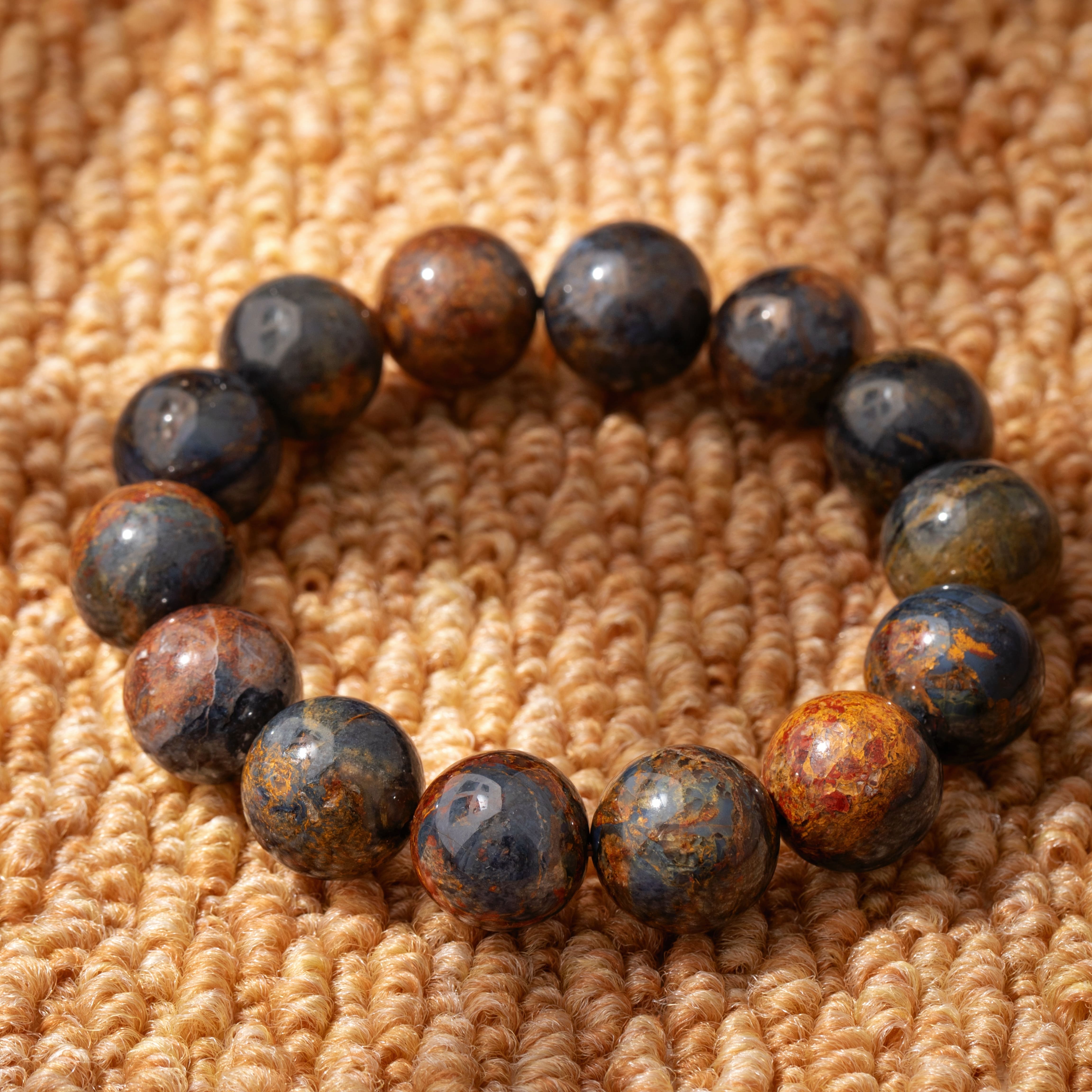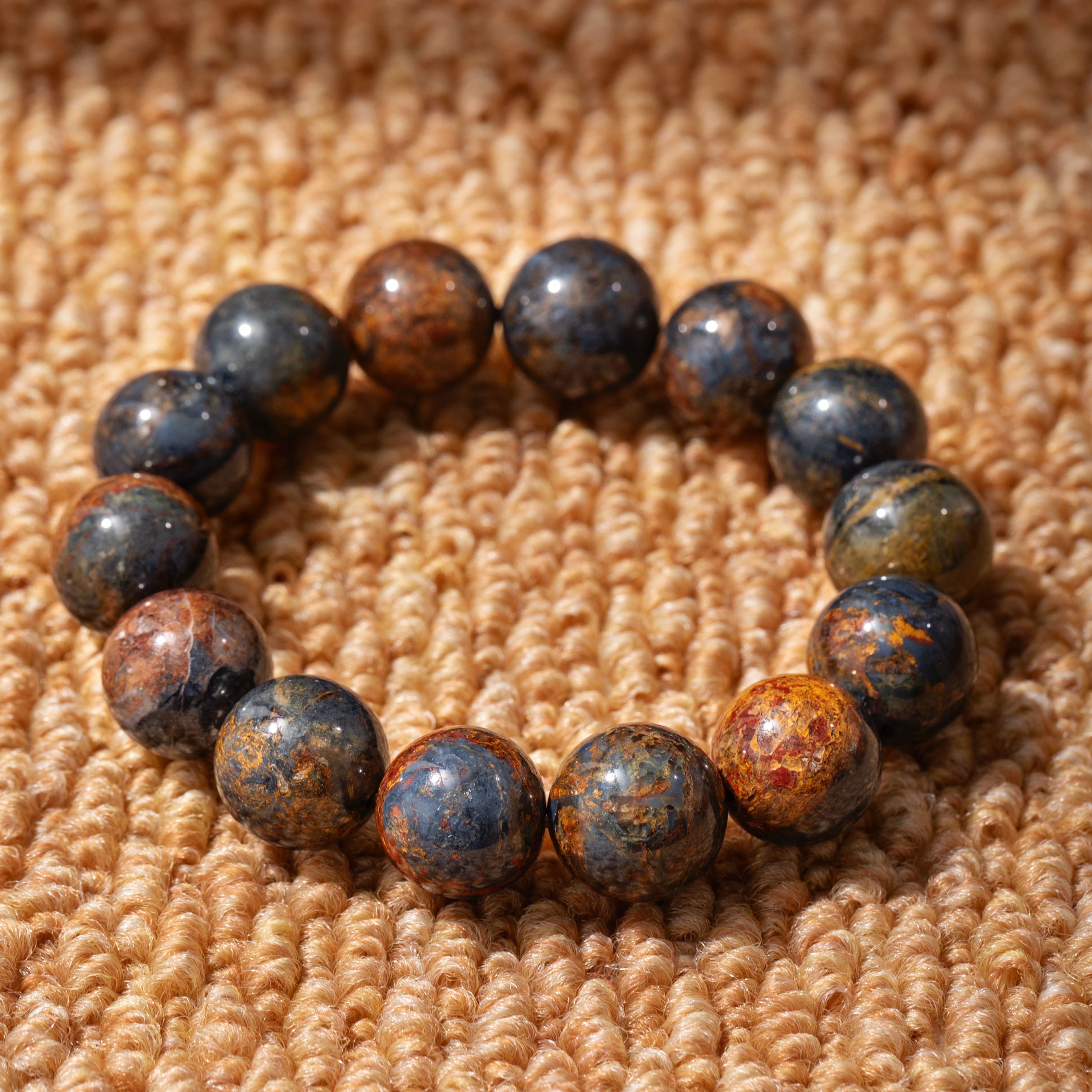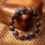 厳選された高品質のブルーペーターストーンが、一粒一粒丁寧に選ばれ、豊かで繊細な青色の色彩と独特なペーターストーン模様を見せています。このブレスレットに使用されているペーターストーンは、その深みのある青色と独特な輝きが、まるで夜空に輝く星々や深海の宝石のように、視覚と心に深い魅力と喜びをもたらします。