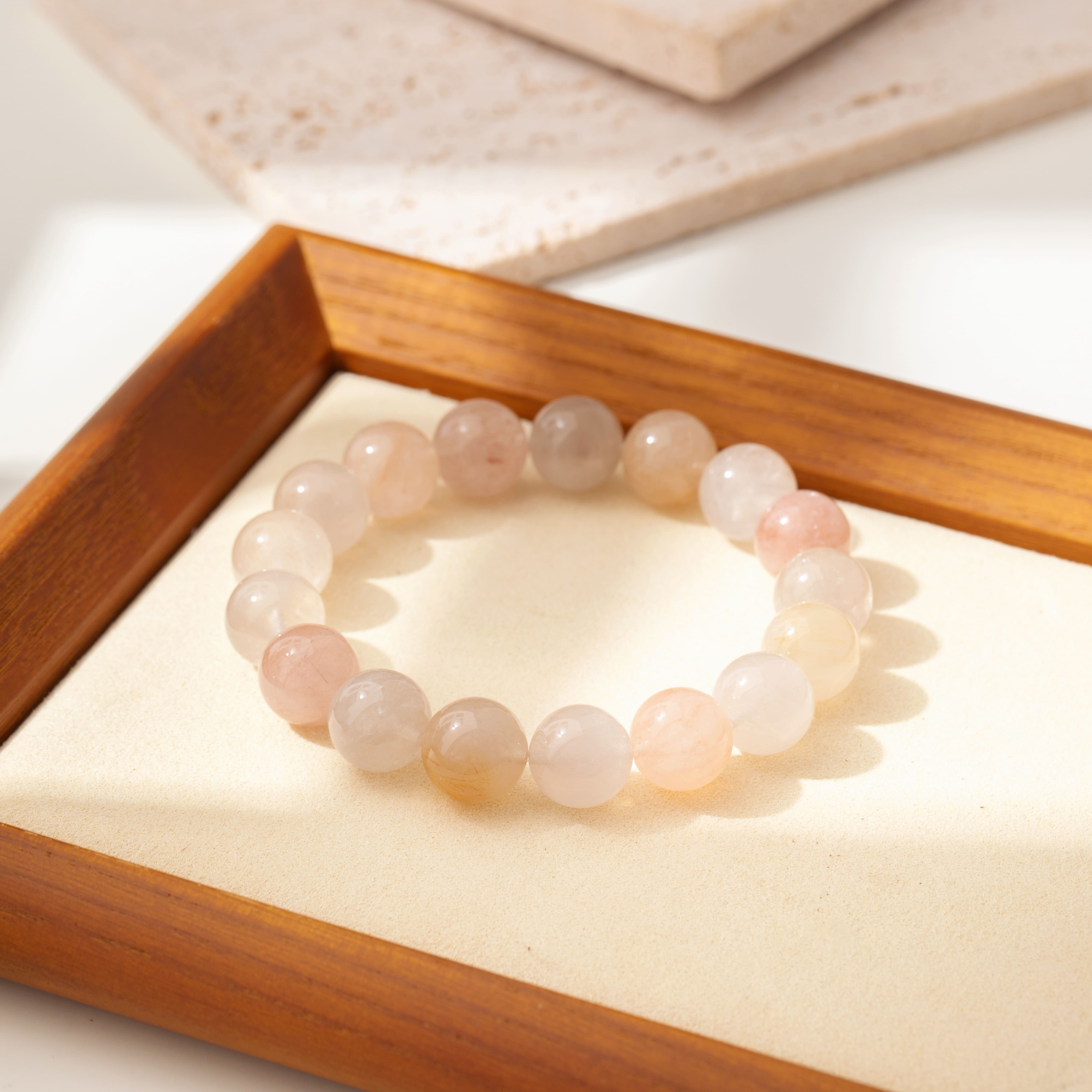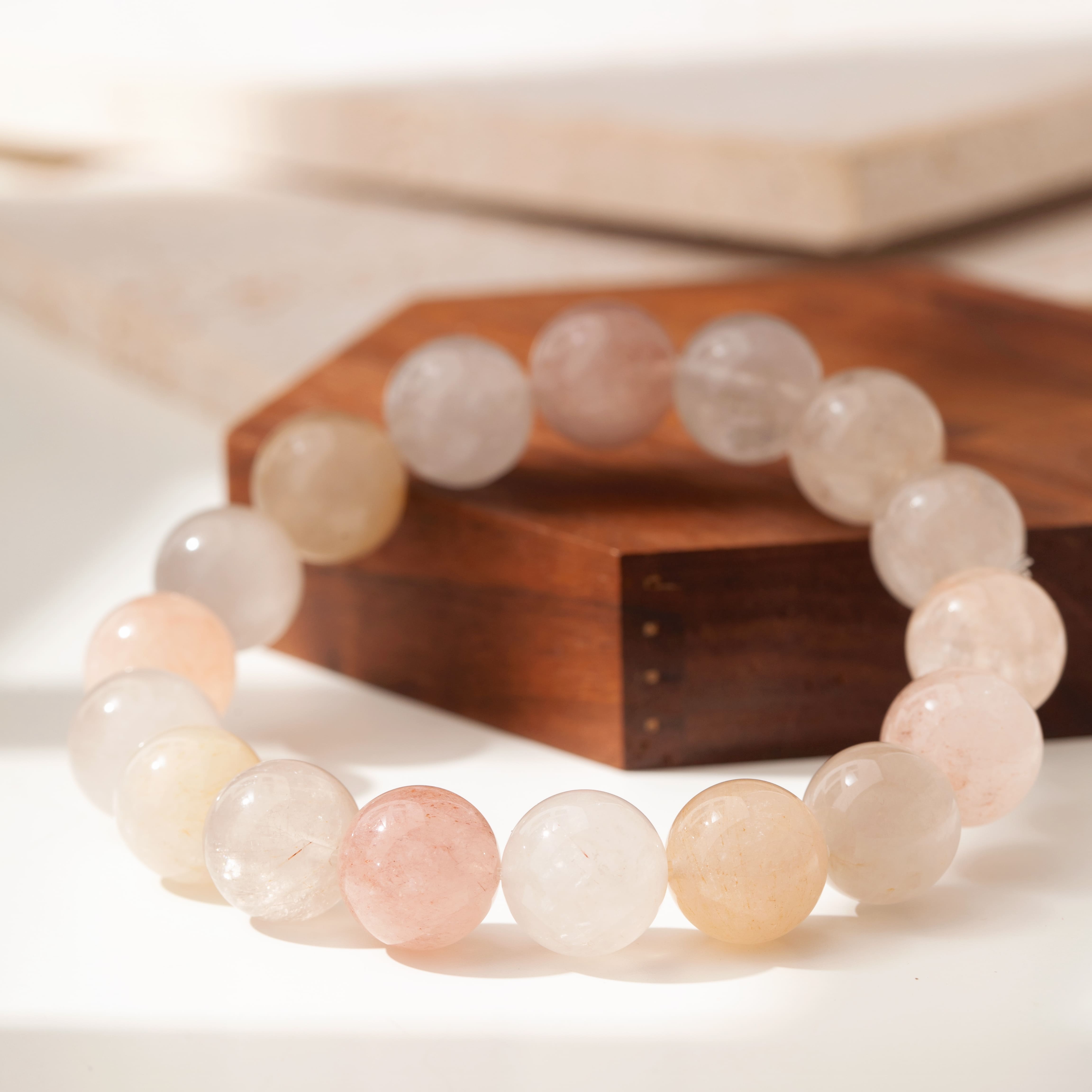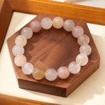 このブレスレットは、柔らかな色合いが織りなす浅彩色のラビットヘアクォーツが一粒一粒組み合わされた特別な一品です。それぞれ異なる淡い色彩の石たちが、まるで春のそよ風のように心を癒してくれます。透明感の中に漂う繊細な毛状模様は、一瞬一瞬を丁寧に生きる大切さを教えてくれるような存在感があります。