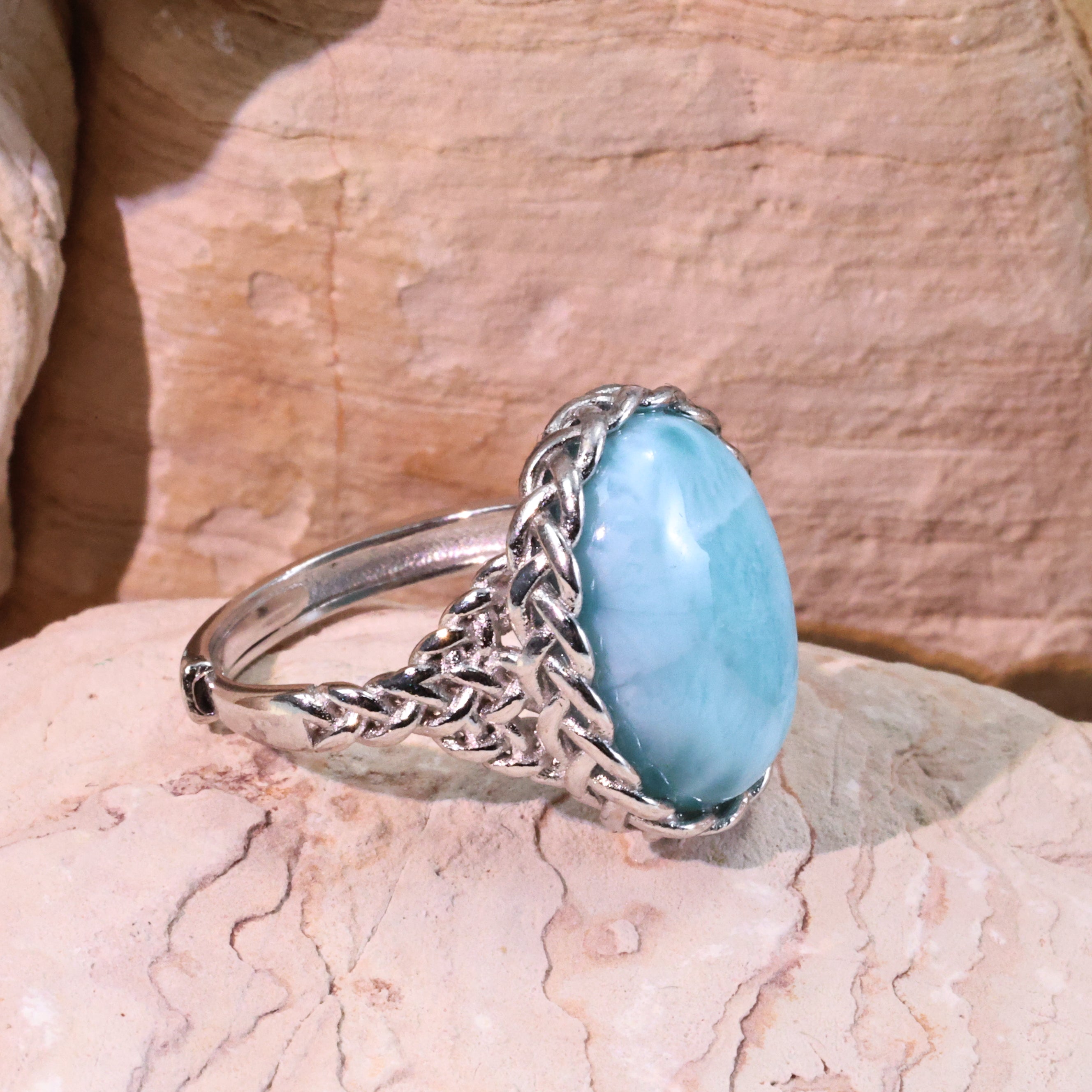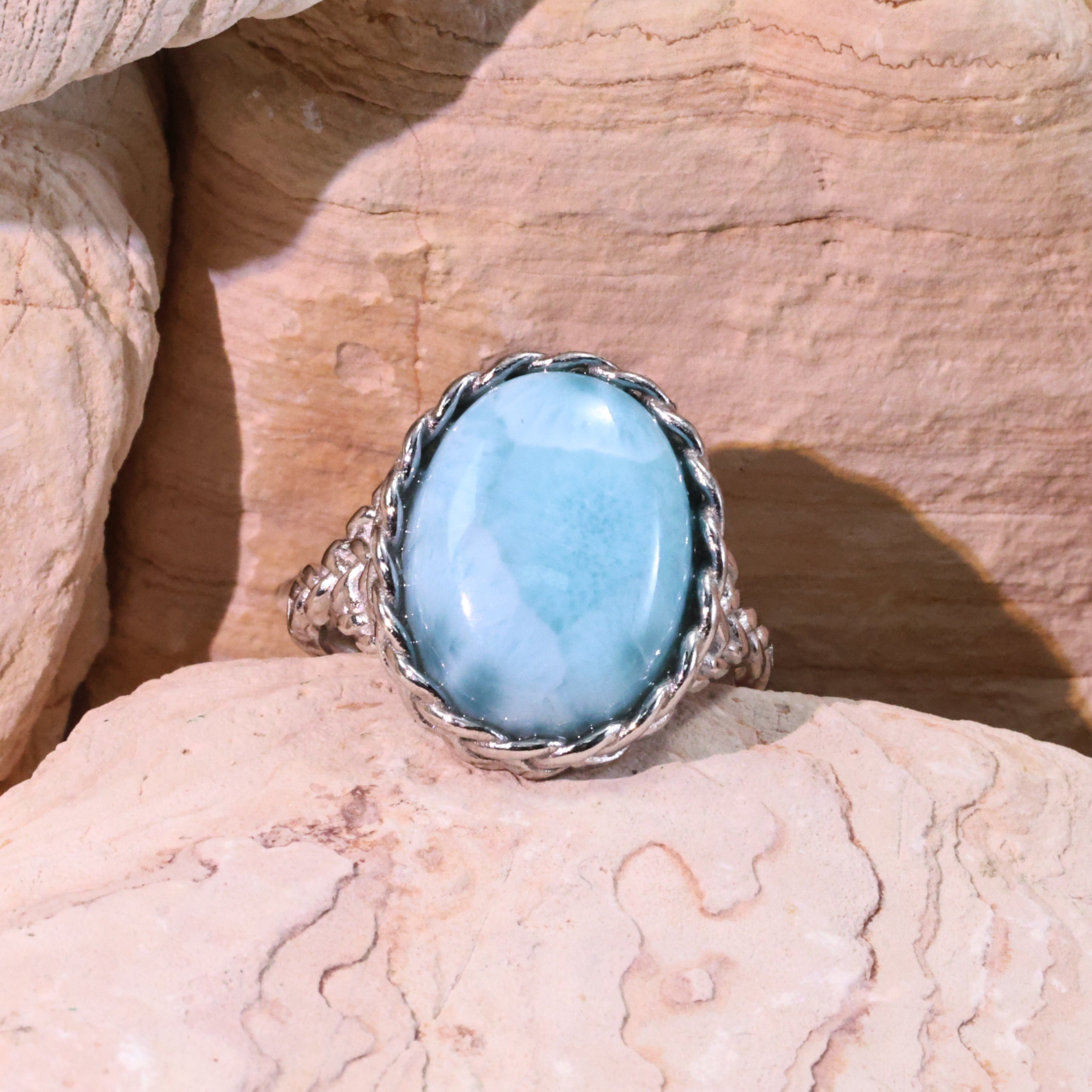 澄み渡る海を想起させる淡い水色が特徴のラリマーを贅沢に使用したリングです。そのやわらかな色合いと自然が紡ぎ出した模様は、まるで静かな波打ち際に差し込む朝の光を閉じ込めたかのよう。ラリマーは「海の宝石」として知られ、その清らかで穏やかなエネルギーは、身に着ける人に内なる平和とリフレッシュした気持ちをもたらすといわれています。