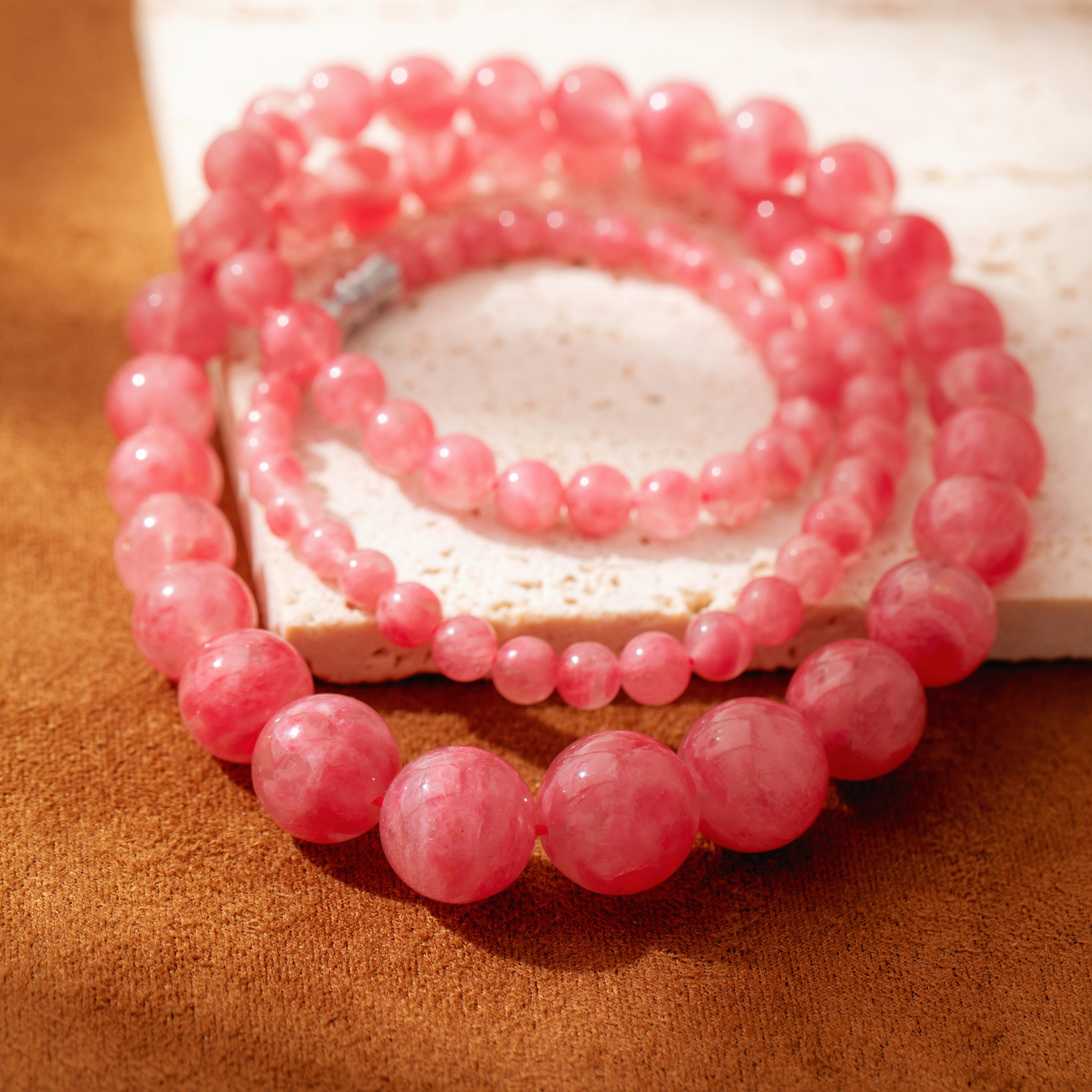 桜の花が舞い散るような美しいデザインのこのローズクォーツタワーネックレスは、春の穏やかな風に包まれるような、優しい印象を与えます。異なる大きさのローズクォーツのビーズを巧みに組み合わせて作られたタワーのようなデザインは、まるで桜の花が降り注ぐ風景を連想させ、特に和服との相性が抜群です。